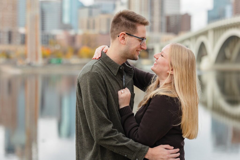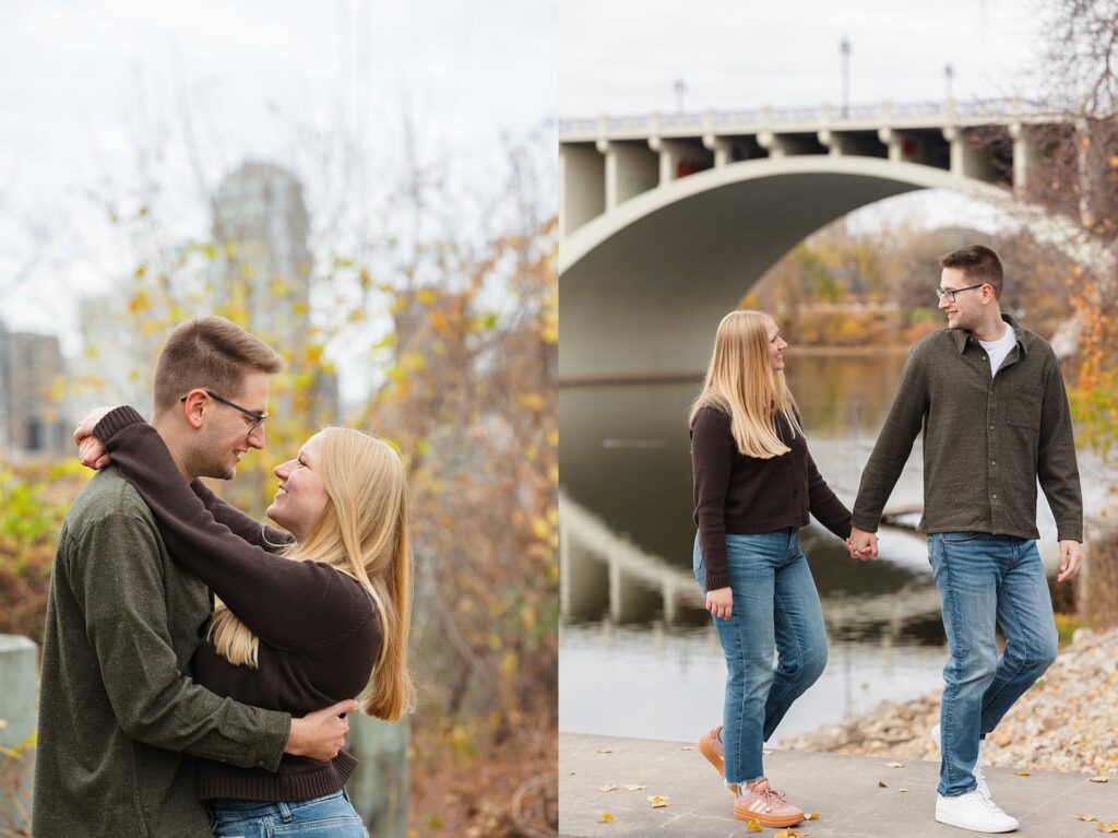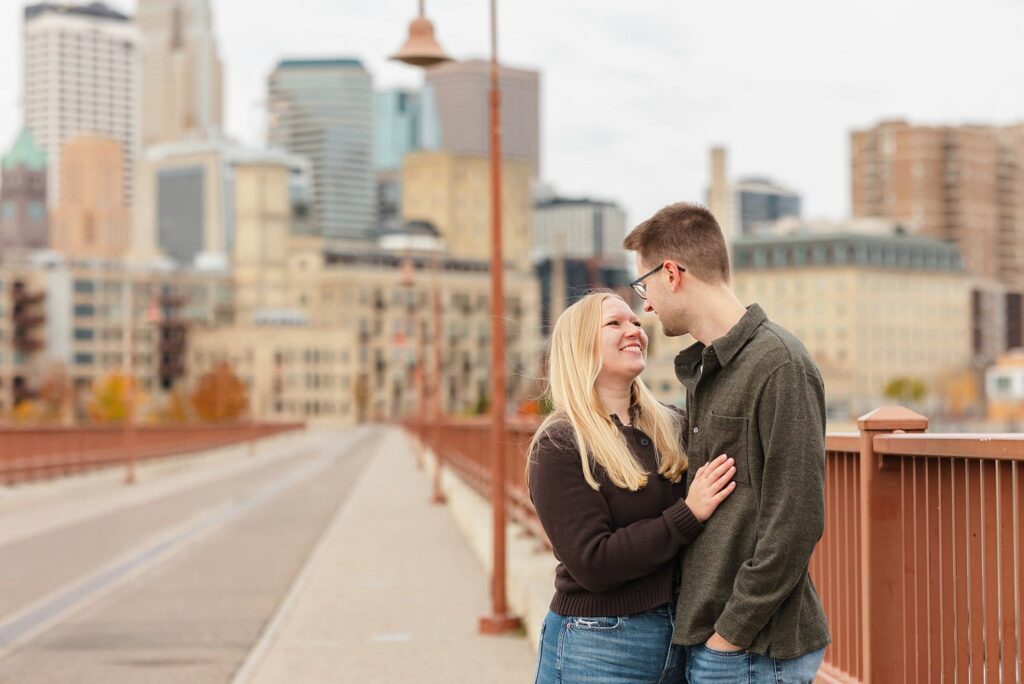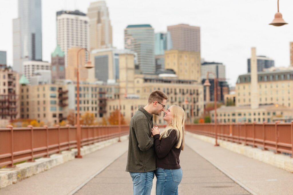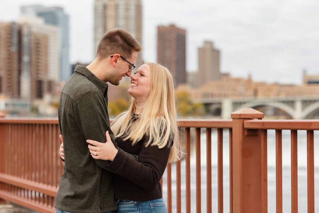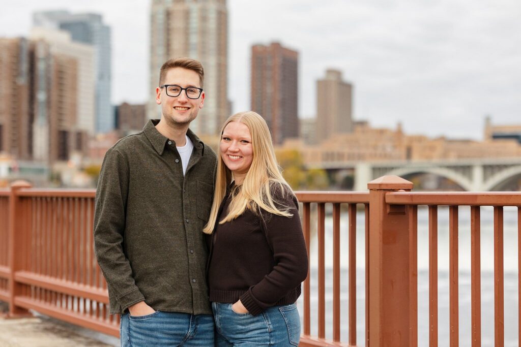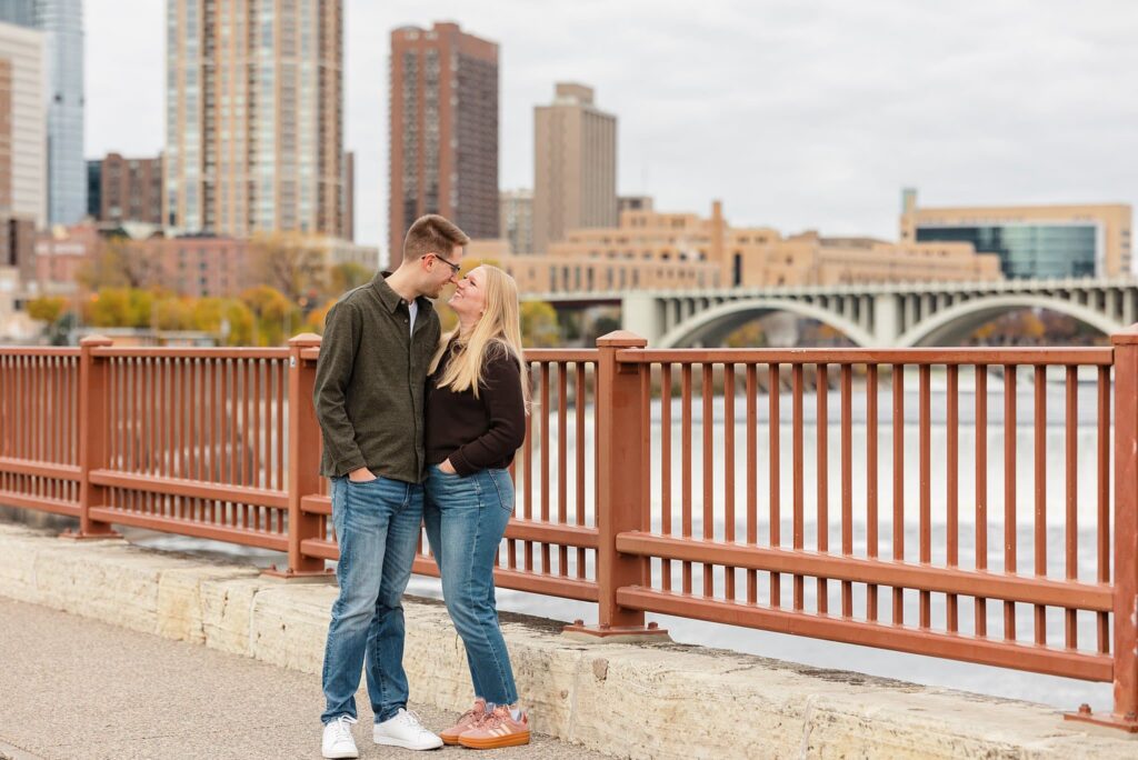 Maret and Ryan had the perfect fall day for a Downtown Minneapolis engagement session! We met downtown and it was a quiet morning along the river. Just as we were about to start photos, we realized a 5k run was coming through the exact area we were taking photos at! Thankfully the runners were on the road and we were using other areas. Then, when there was the perfect break in runners, we were able to use the walking bridge for a few photos as well. The tall buildings across the river made for the perfect backdrop!