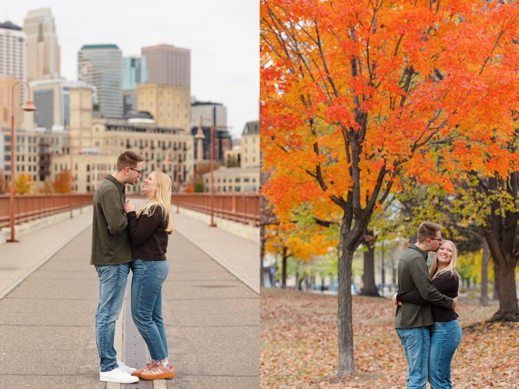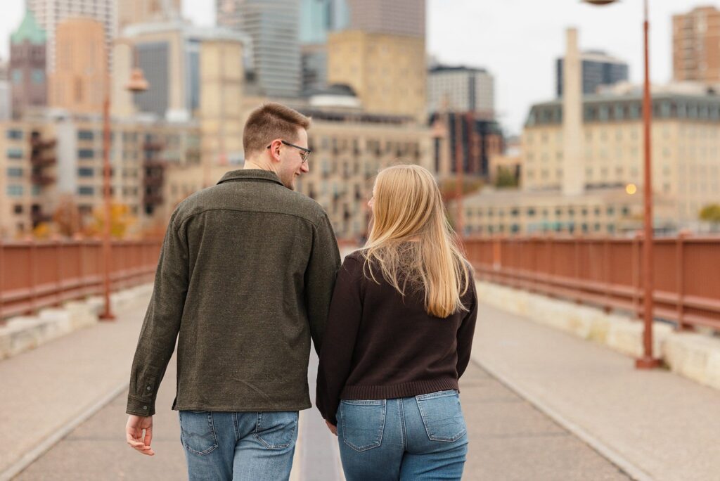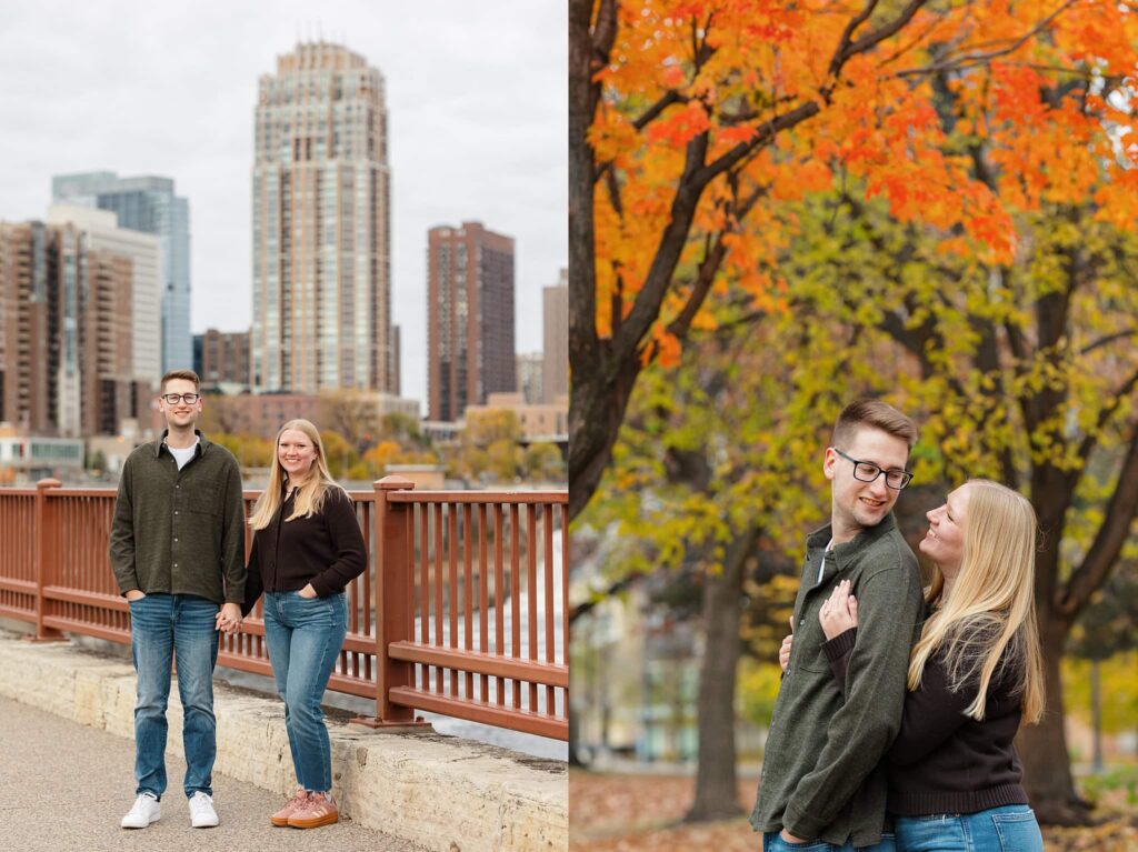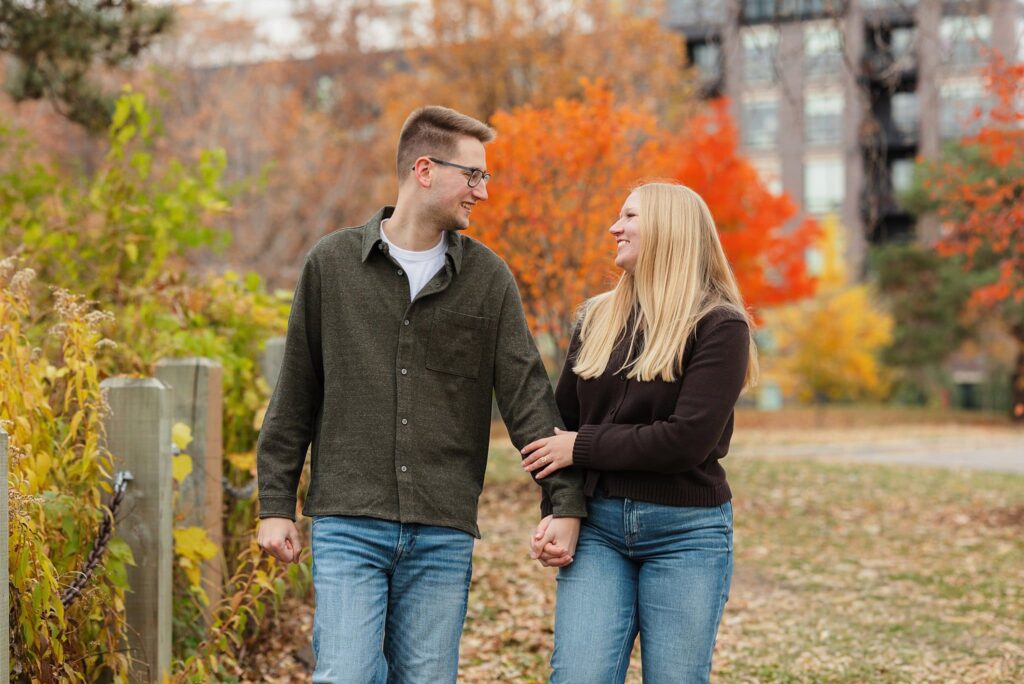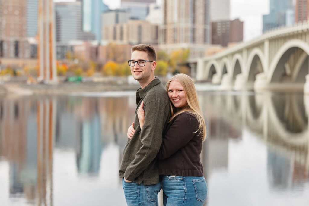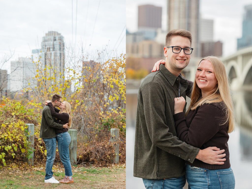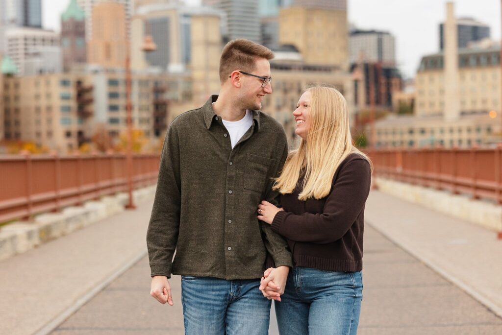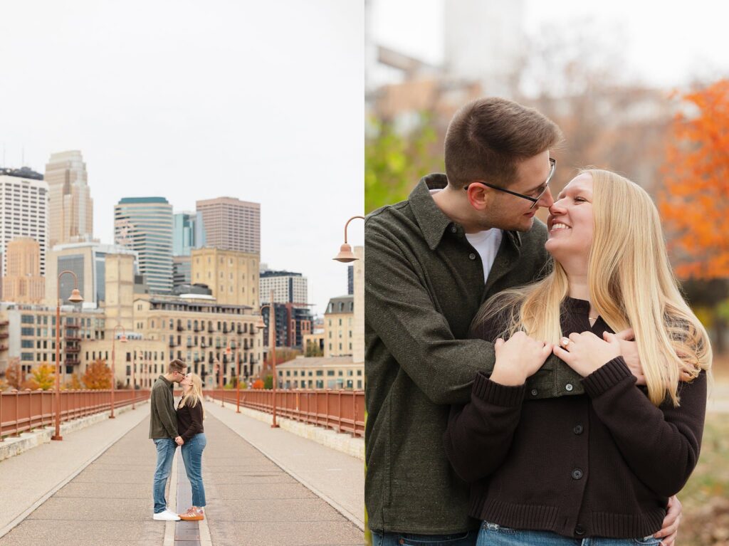 Maret and Ryan had the perfect fall day for a Downtown Minneapolis engagement session! We met downtown and it was a quiet morning along the river. Just as we were about to start photos, we realized a 5k run was coming through the exact area we were taking photos at! Thankfully the runners were on the road and we were using other areas. Then, when there was the perfect break in runners, we were able to use the walking bridge for a few photos as well. The tall buildings across the river made for the perfect backdrop!