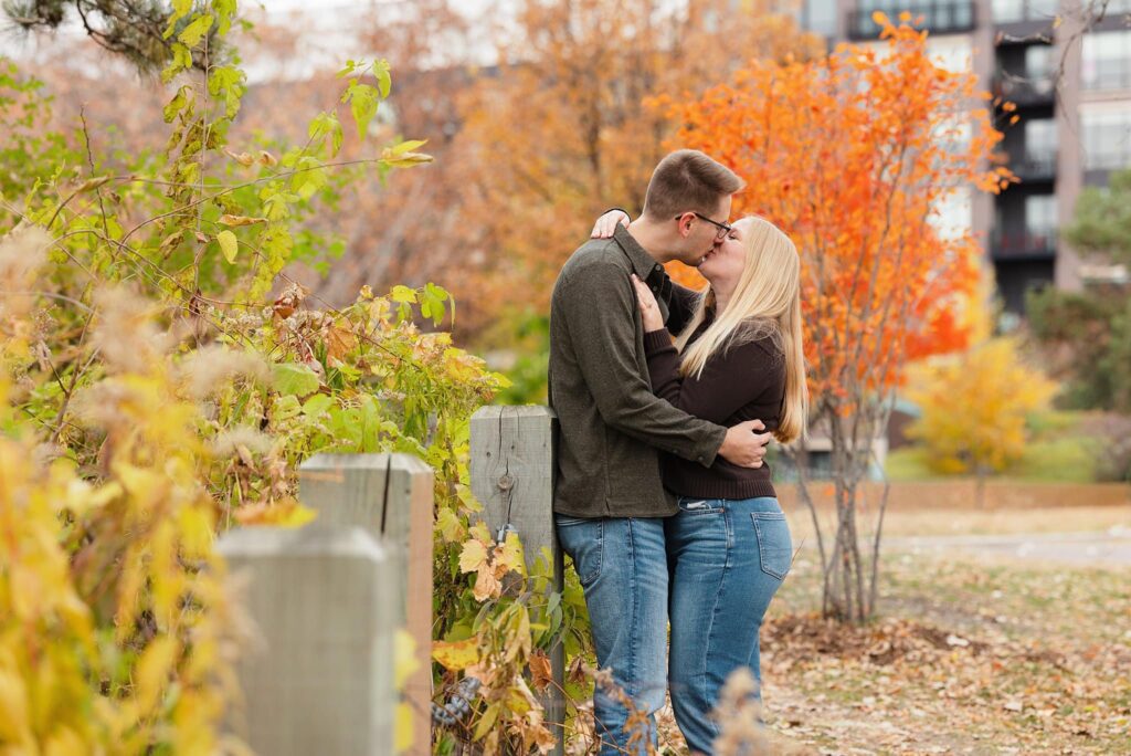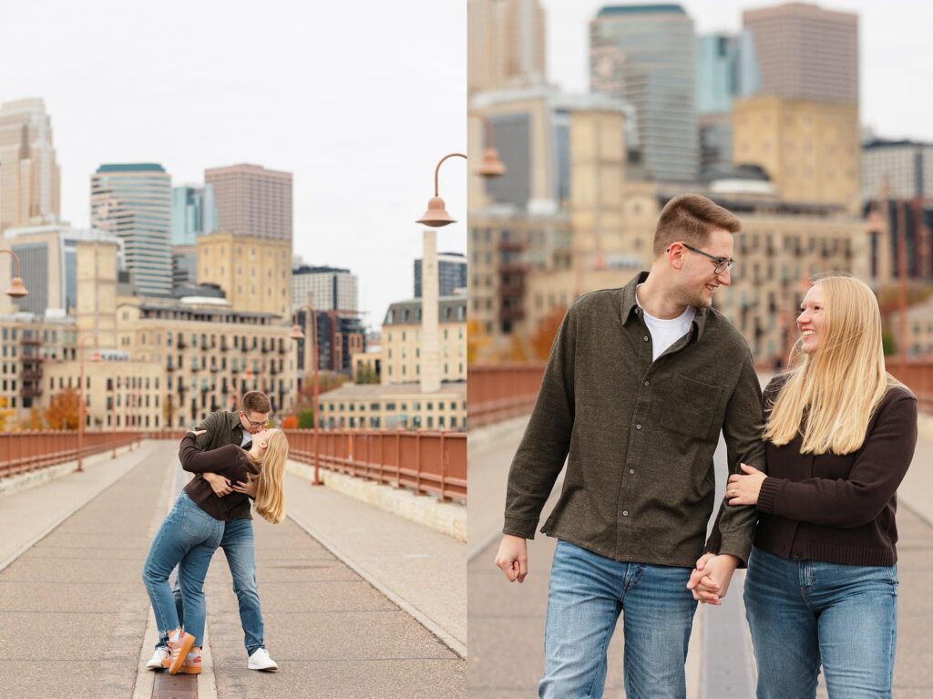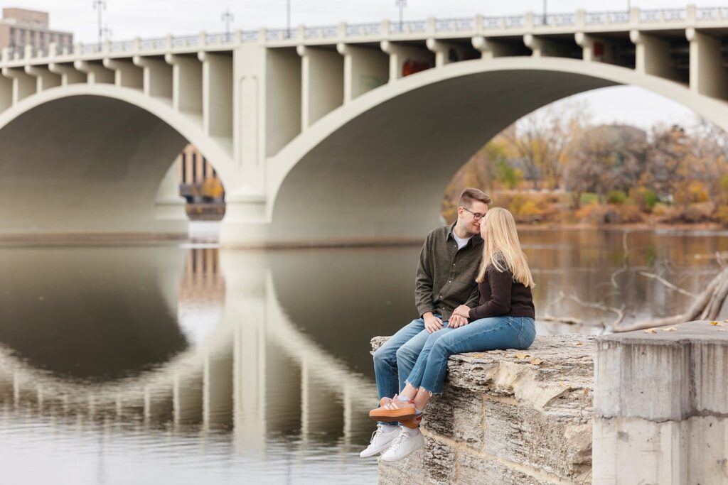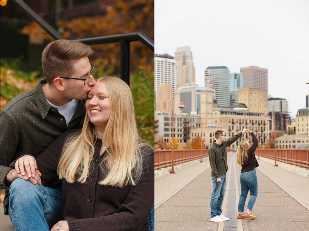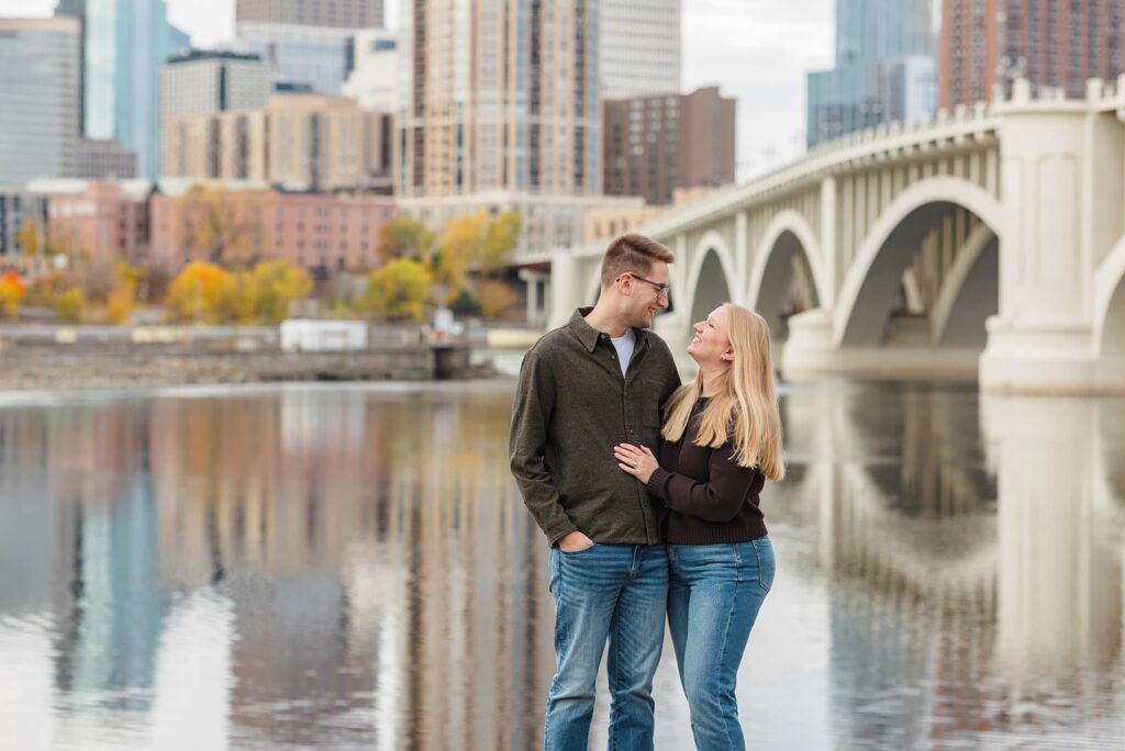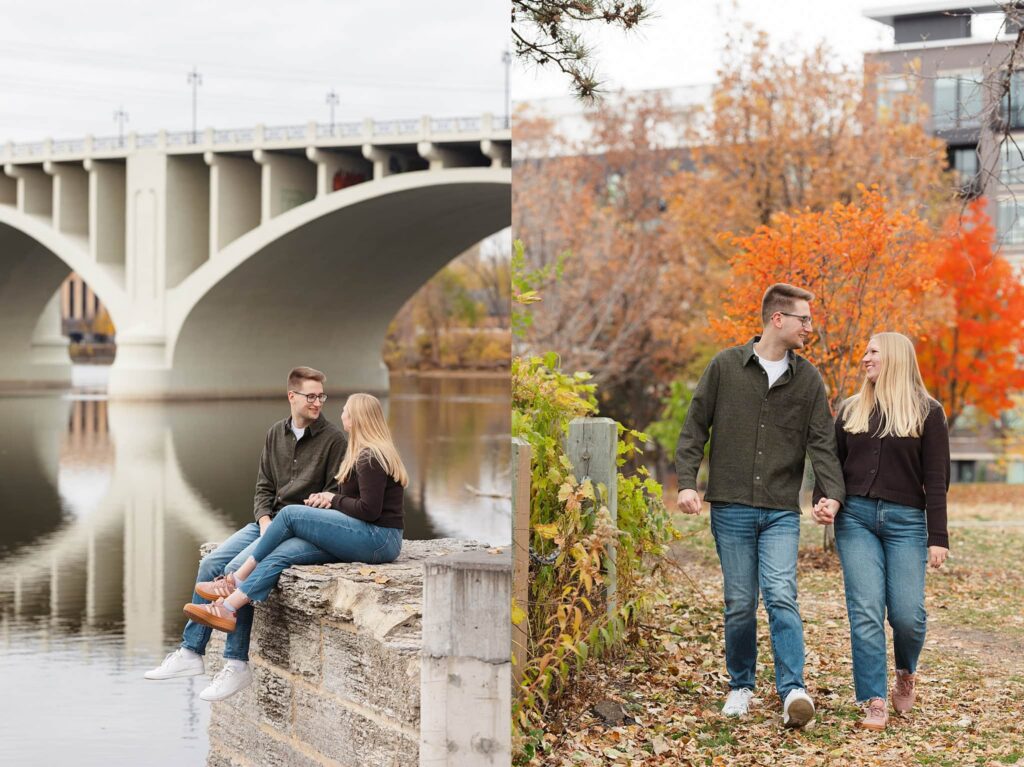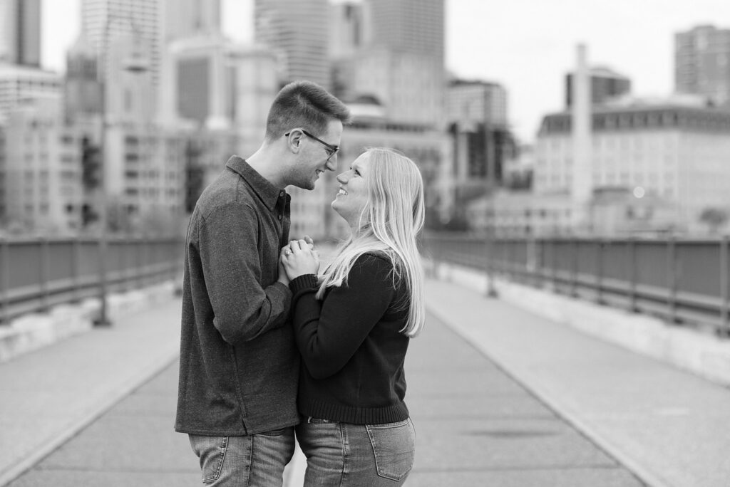 Maret and Ryan had the perfect fall day for a Downtown Minneapolis engagement session! We met downtown and it was a quiet morning along the river. Just as we were about to start photos, we realized a 5k run was coming through the exact area we were taking photos at! Thankfully the runners were on the road and we were using other areas. Then, when there was the perfect break in runners, we were able to use the walking bridge for a few photos as well. The tall buildings across the river made for the perfect backdrop!