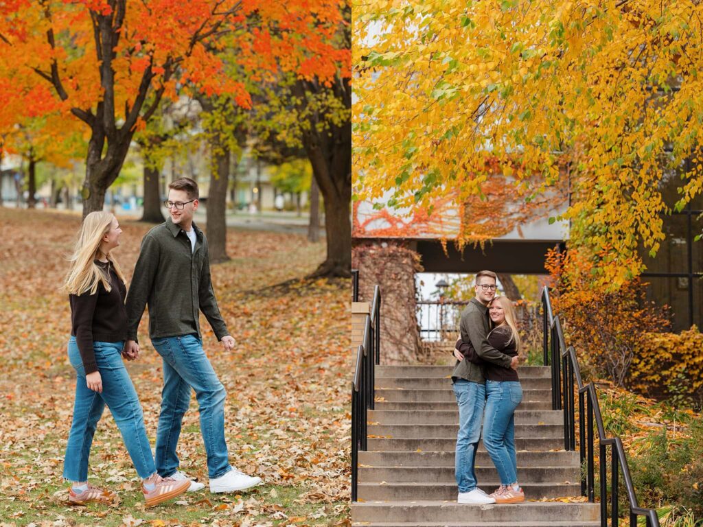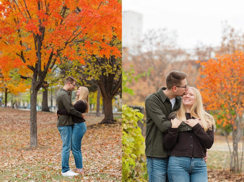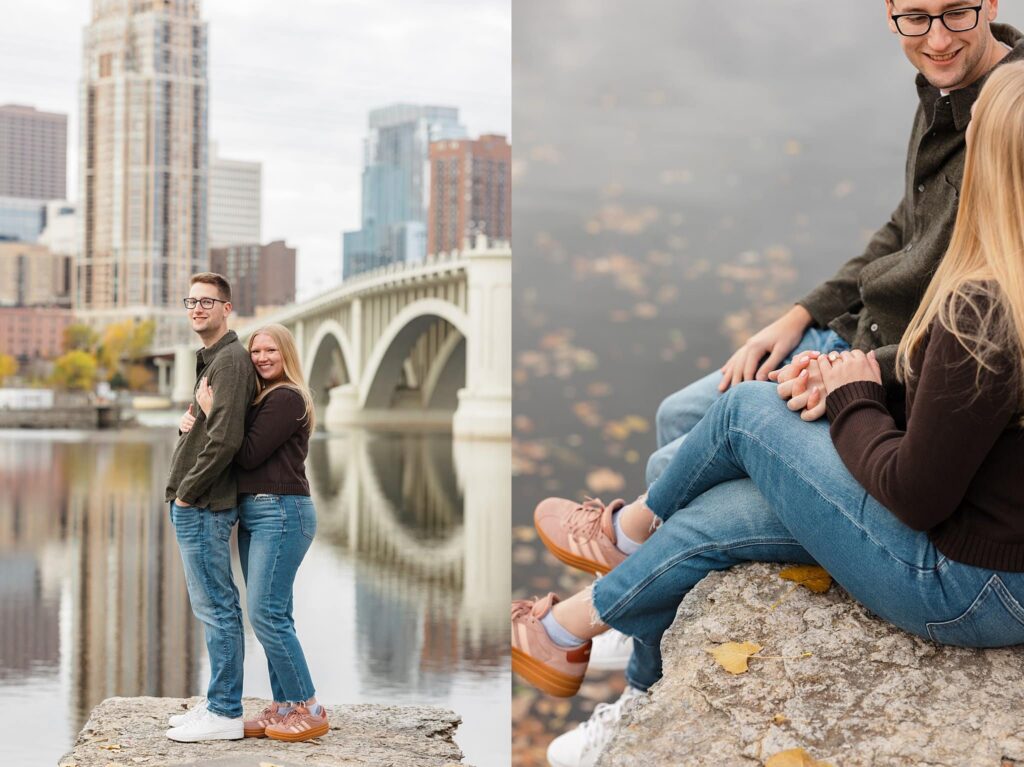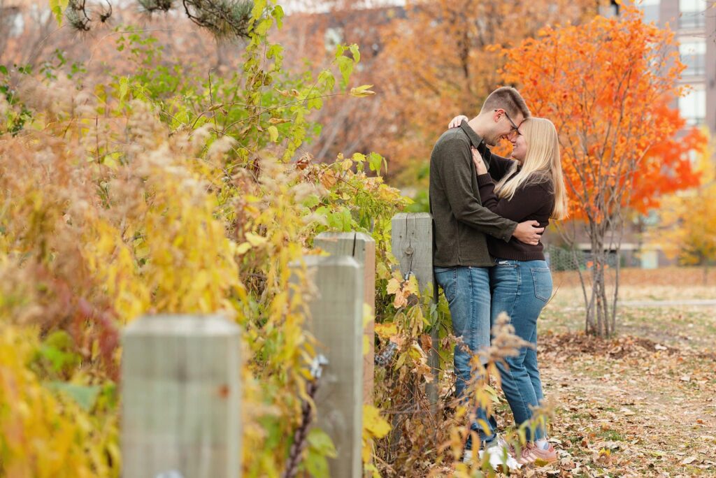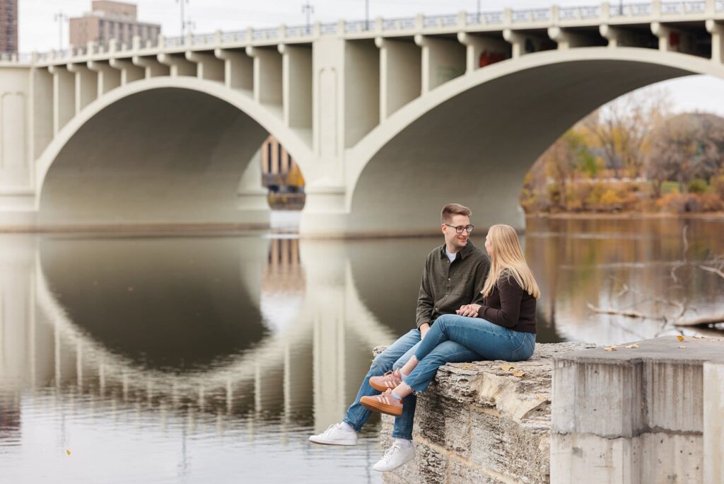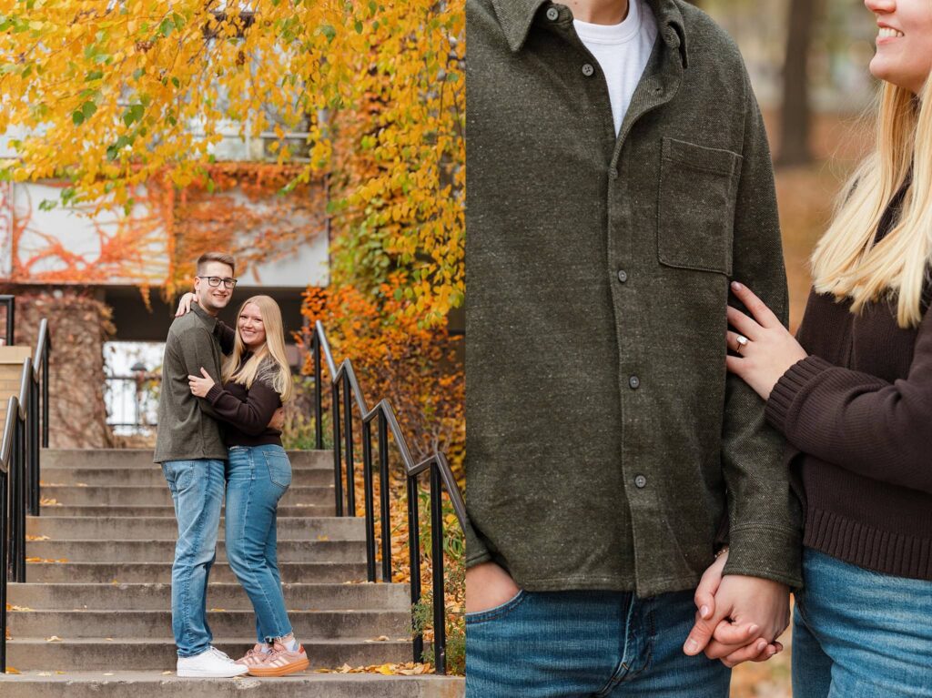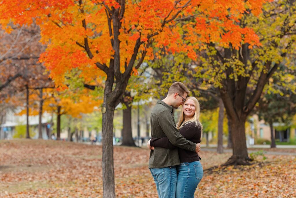 Maret and Ryan had the perfect fall day for a Downtown Minneapolis engagement session! We met downtown and it was a quiet morning along the river. Just as we were about to start photos, we realized a 5k run was coming through the exact area we were taking photos at! Thankfully the runners were on the road and we were using other areas. Then, when there was the perfect break in runners, we were able to use the walking bridge for a few photos as well. The tall buildings across the river made for the perfect backdrop!
