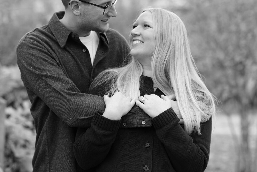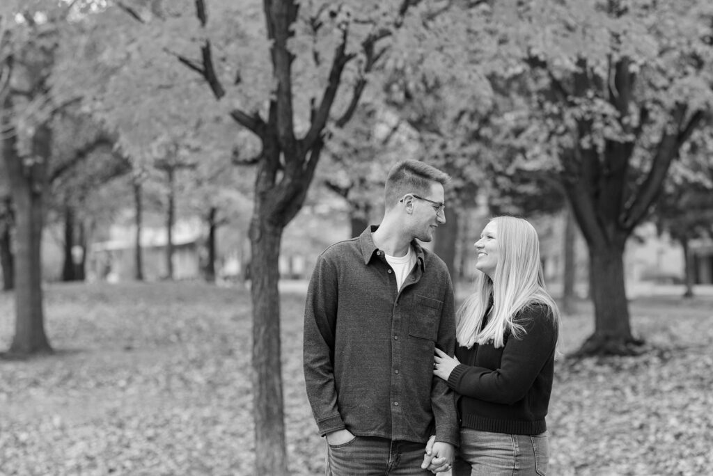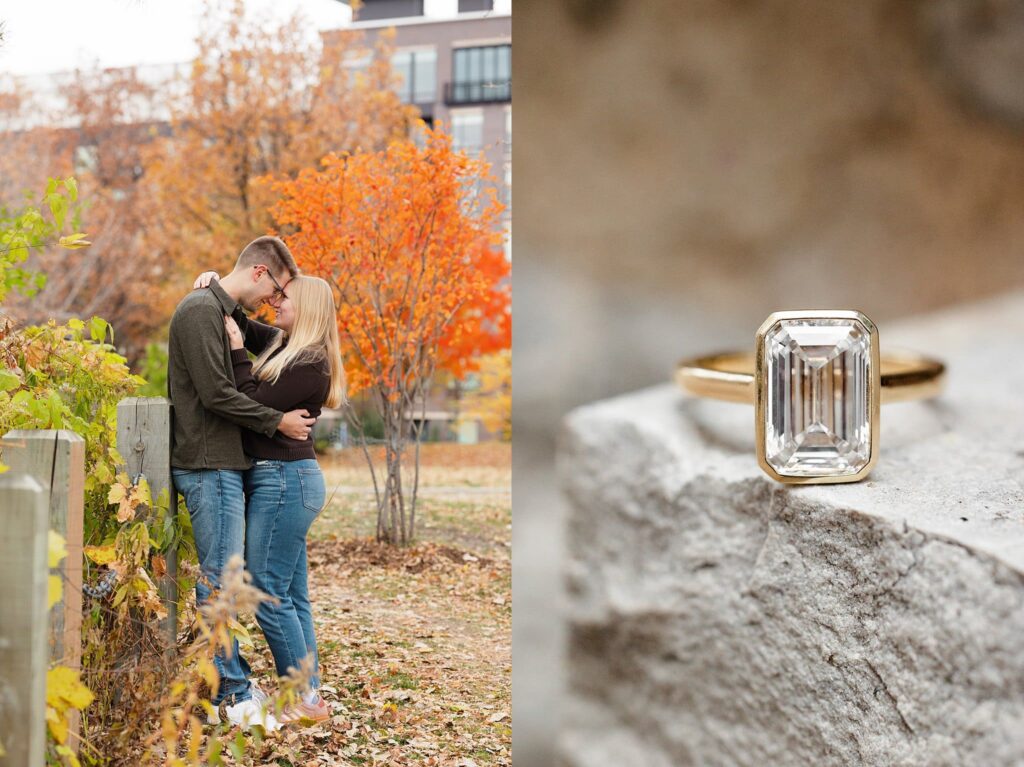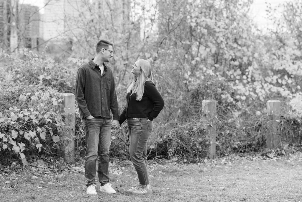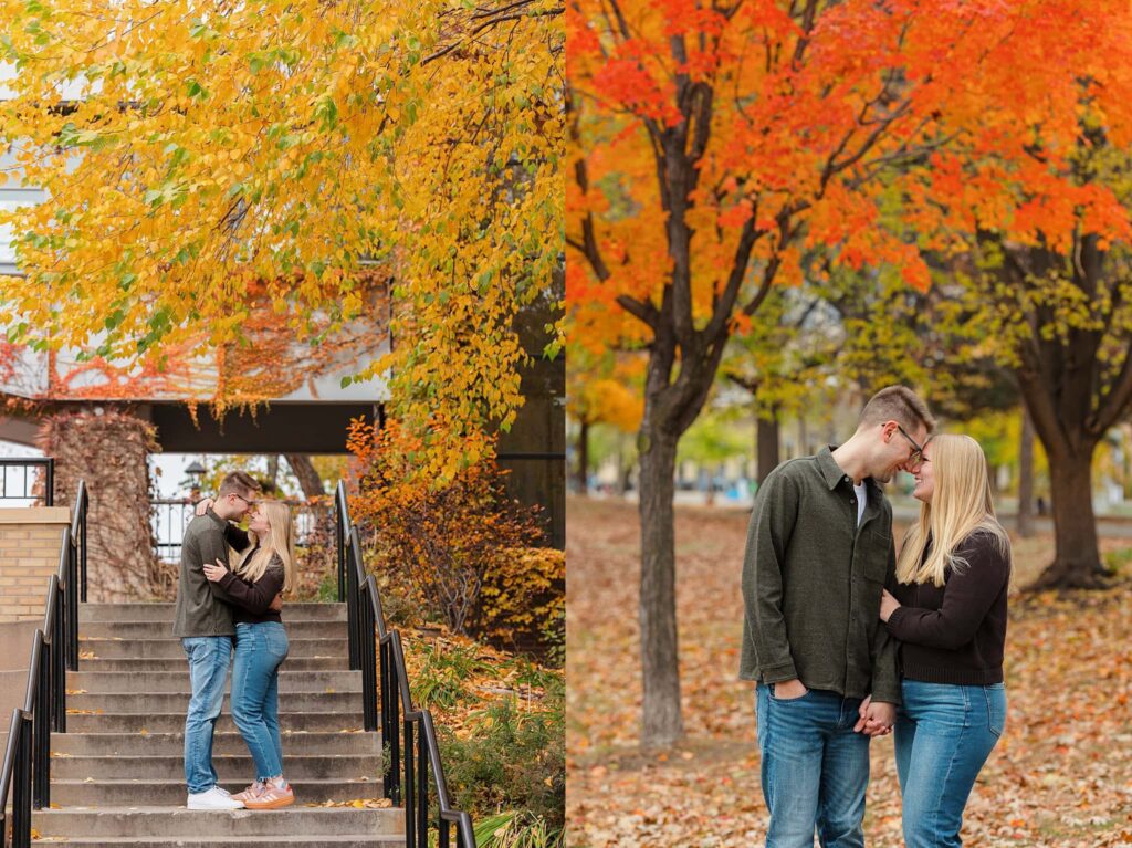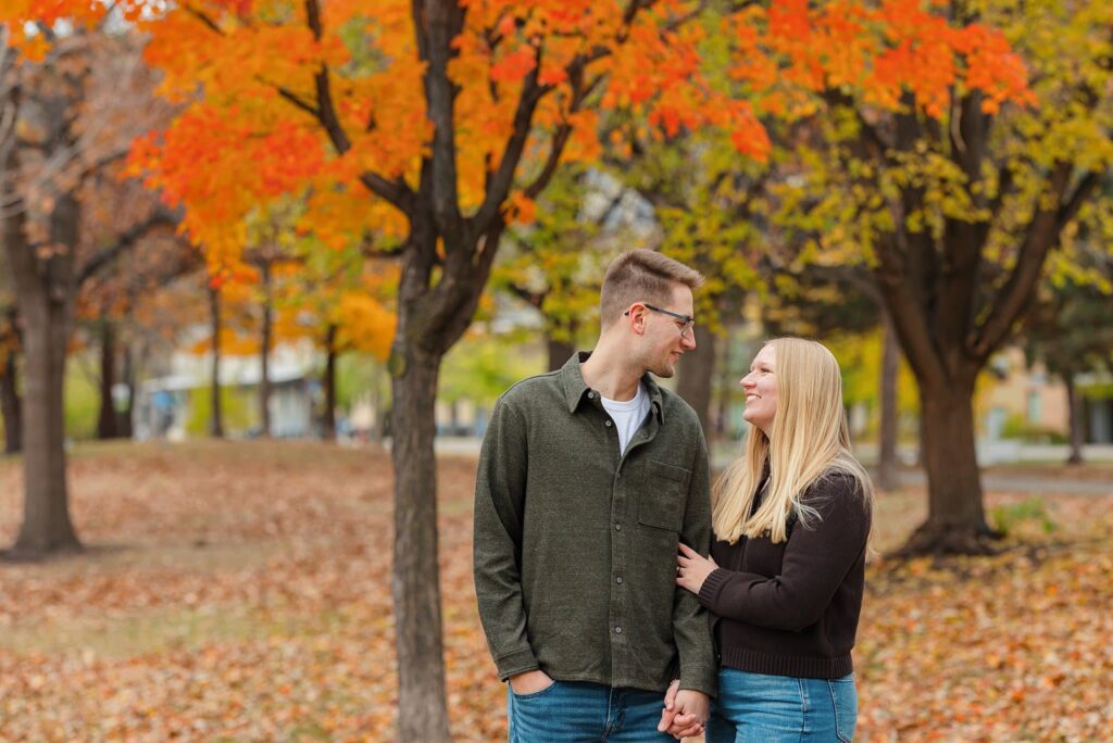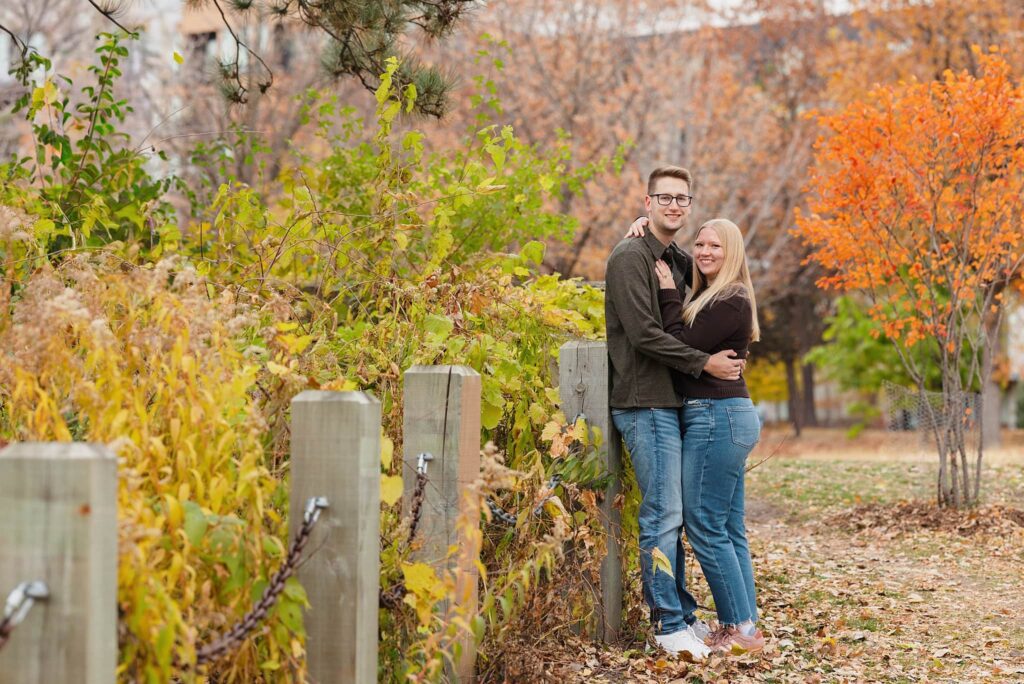 Maret and Ryan had the perfect fall day for a Downtown Minneapolis engagement session! We met downtown and it was a quiet morning along the river. Just as we were about to start photos, we realized a 5k run was coming through the exact area we were taking photos at! Thankfully the runners were on the road and we were using other areas. Then, when there was the perfect break in runners, we were able to use the walking bridge for a few photos as well. The tall buildings across the river made for the perfect backdrop!